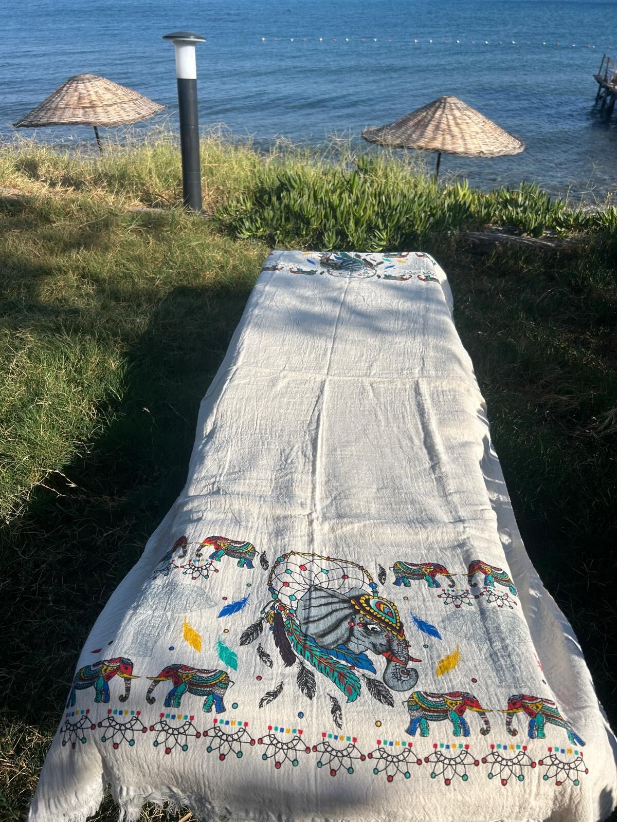 %100 pamuk müslin kumaştan üretilmiş olup, plajda ve havuz kenarında rahatlıkla kullanılabilir.