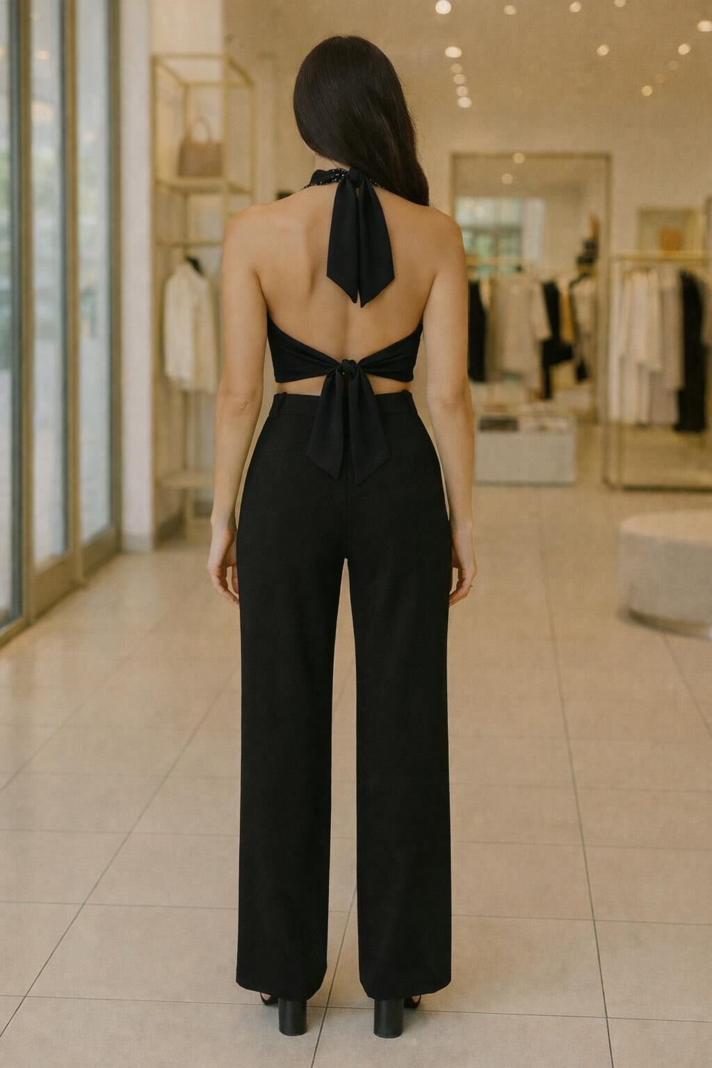 Sırtı açık ve zarif bağlamalı tasarımıyla feminen bir şıklık sunar.