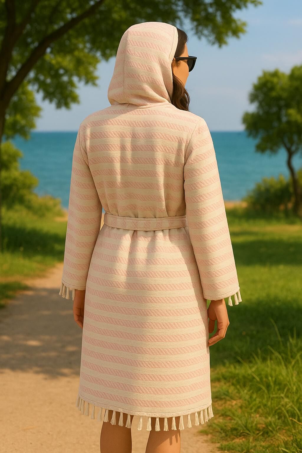 Özel Üretim Kapüşonlu Pamuk Dokuma Unisex Bornoz / Peştemal olarak 4 mevsim tercih edilebilir.