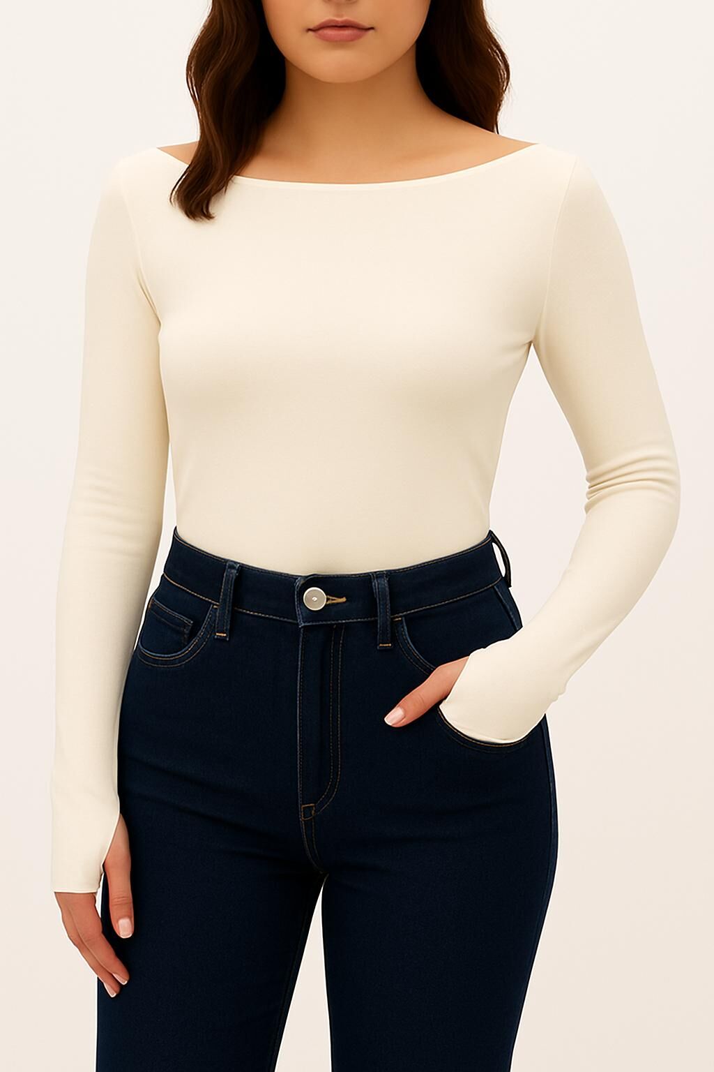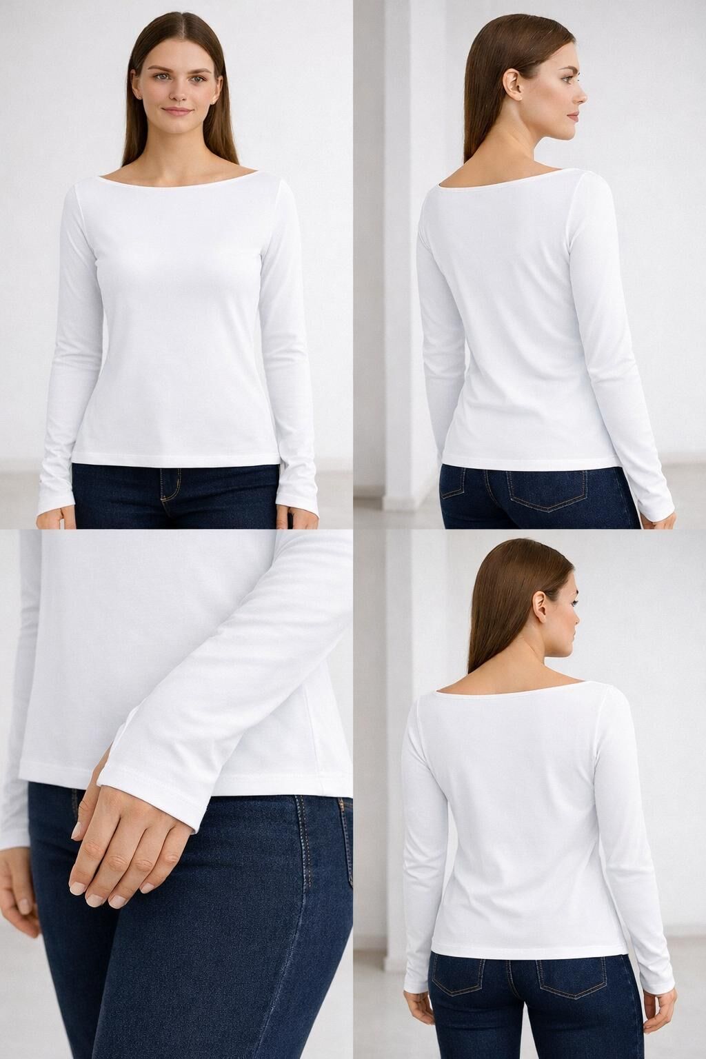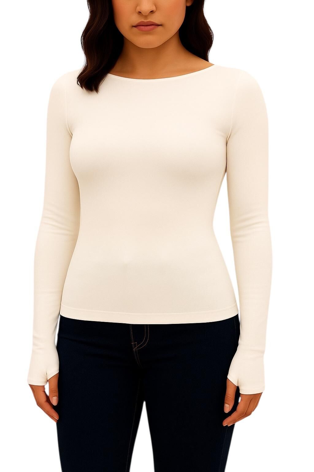 Yumuşak Modal Dokulu Pamuk Dokuma Uzun Kol Parmak Geçmeli Kayık Yaka Body – Basic Bluz