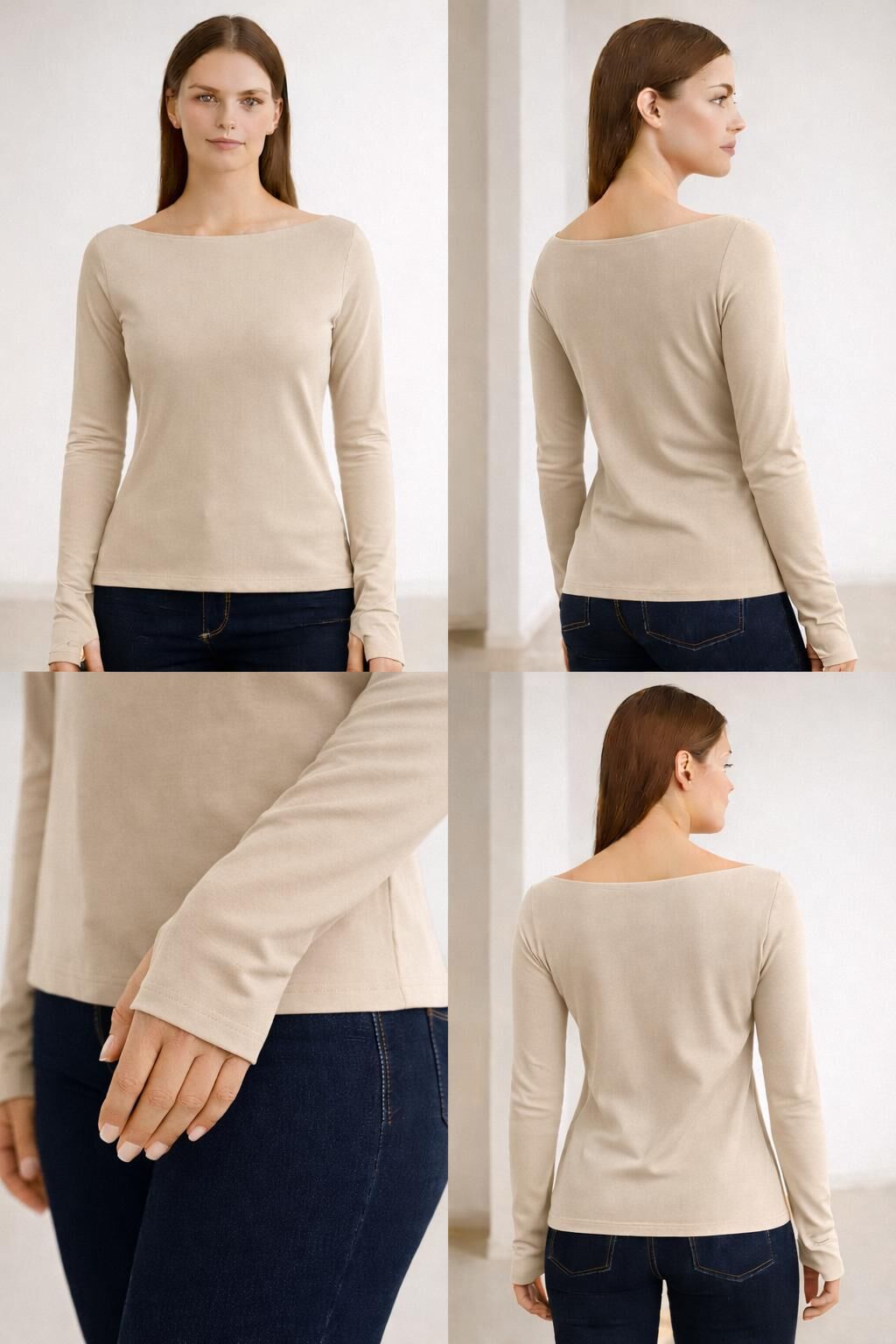 Yumuşak Modal Dokulu Pamuk Dokuma Uzun Kol Parmak Geçmeli Kayık Yaka Body – Basic Bluz